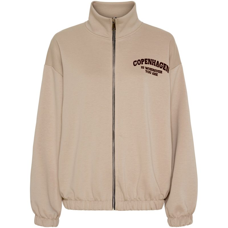 Lækker cardigan i latte farvet, med tryk på ryggen " Copenhagen"